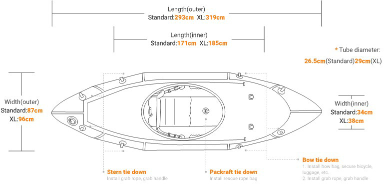 Sportliches Design aus symmetrisch schnittigem Rumpf mit sehr geringem Kielsprung (gerade Wasserlinie), spitzem Bug, gestrecktem Heck, körperbetonter Passform, zentraler Sitzposition, 8 Gepäck-/Halteschlaufen (4 am Heck, 4 am Bug), aufrollbarem Verdeck und Hauptventil mit Rückschlag, Beschlag für Finne/Skeg