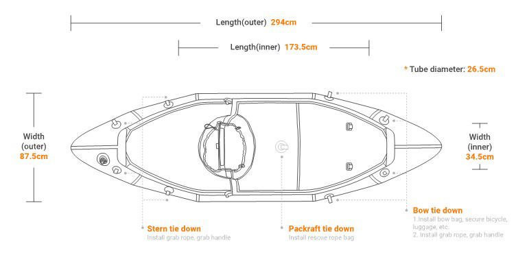 Das Packraft besitzt eine integrierte Halterung (Beschlag/Softmount) für die Aufnahme einer abnehmbaren Finne/Skeg, welche für erhöhte Spurtreue und Geschwindigkeit sorgt. Eine Finne ist Teil des Lieferumfangs.